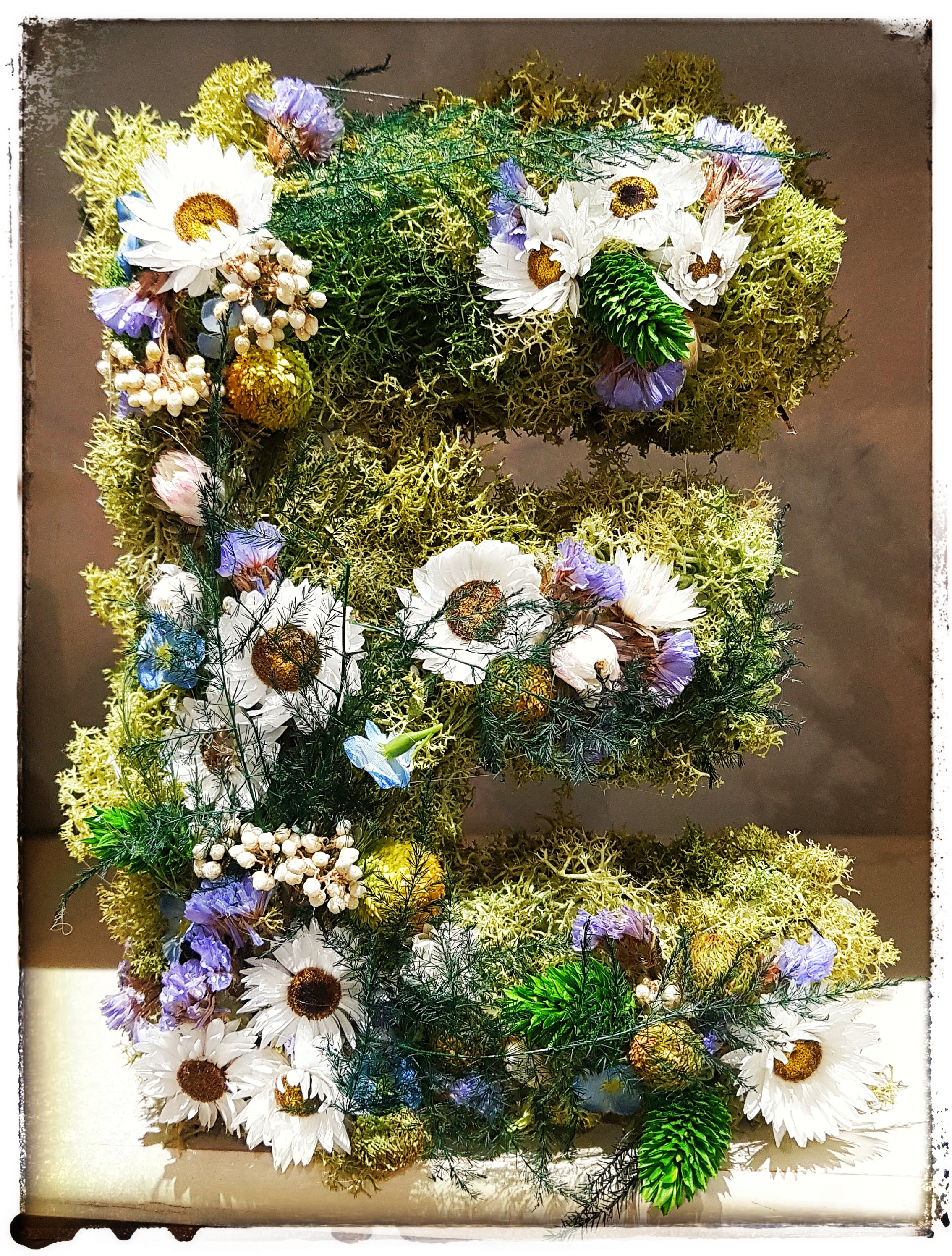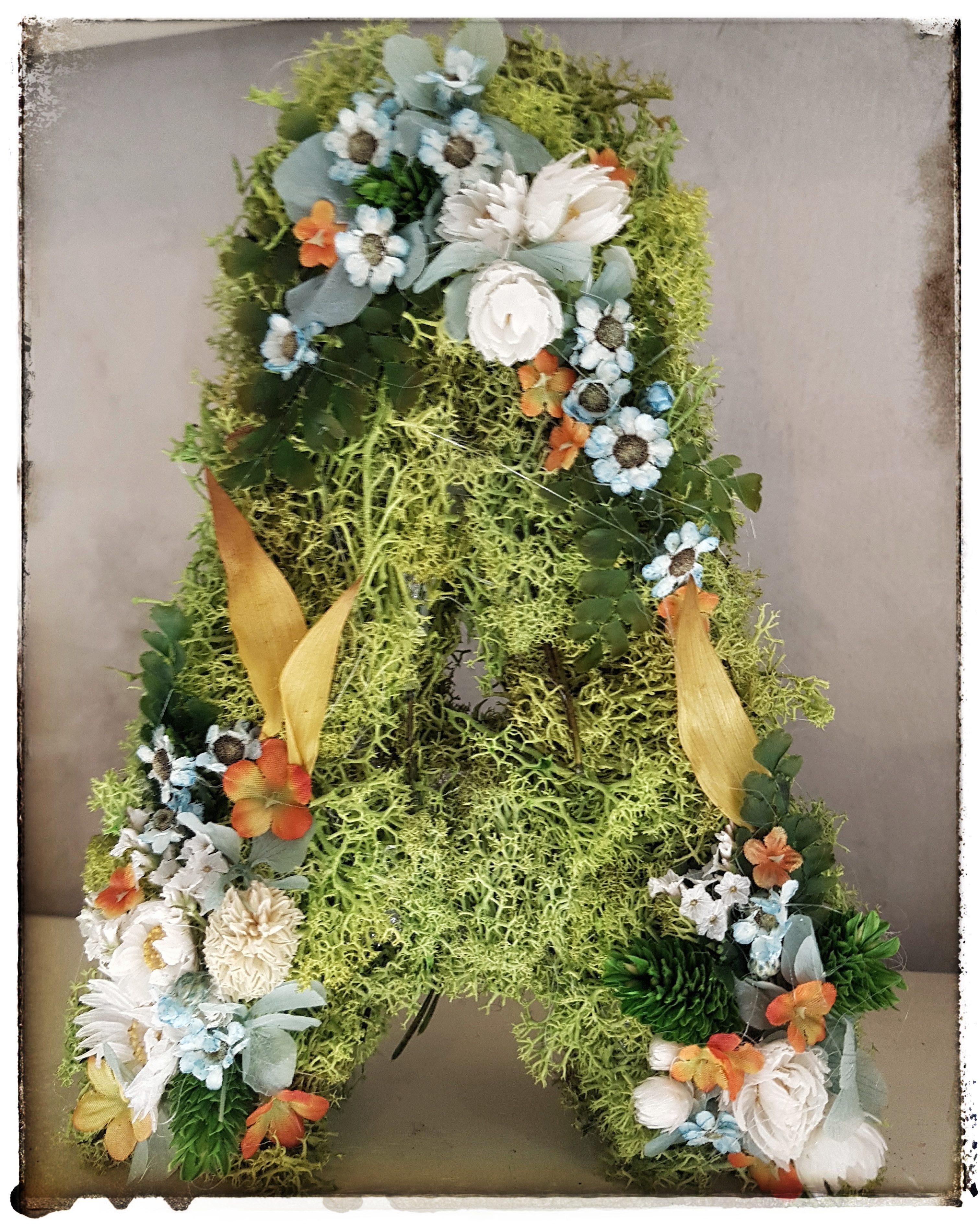 Letras en flor preservada, y seco. Un detalle muy personal.
